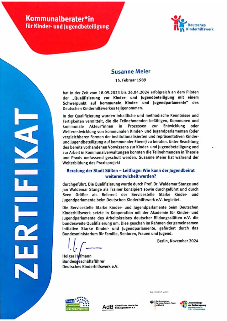 Ich nahm an dem Pilotprojekt „Qualifizierung zur Kinder- und Jugendbeteiligung mit einem Schwerpunkt auf kommunale Kinder- und Jugendparlamente“ des Deutschen Kinderhilfwerkes teil.